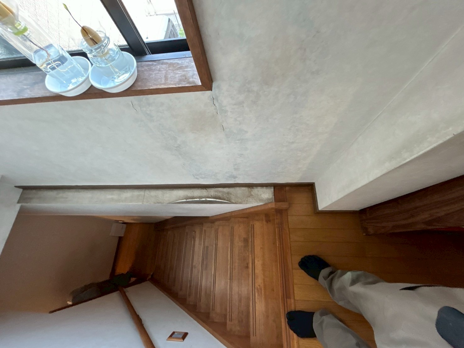 お客様の建物では3階と2階の南側ベランダそれぞれから雨漏りが発生しており、その影響で2階のキッチンや階段、さらには1階の仏間にまで雨漏りの水が届いていました。