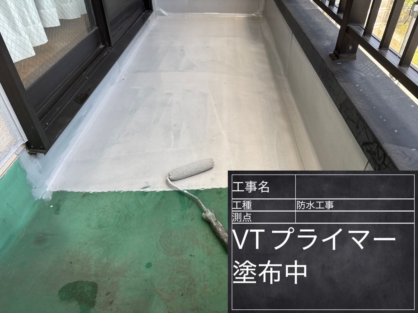 名古屋匠塗装では塩ビシート防水の上に2種類のプライマー施工をしています。