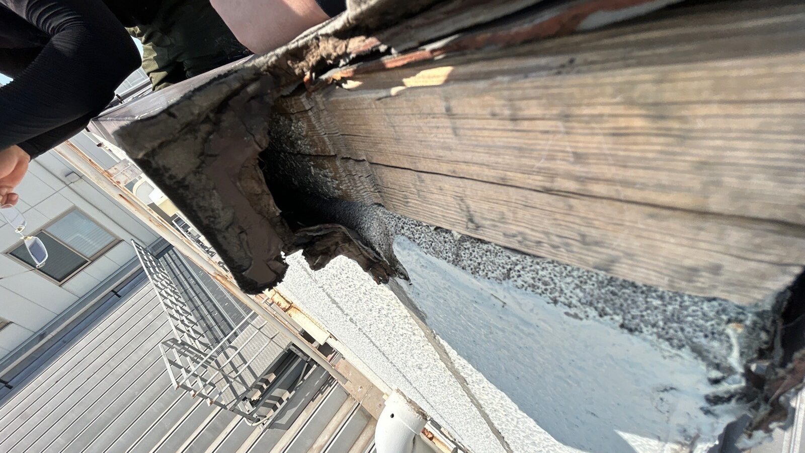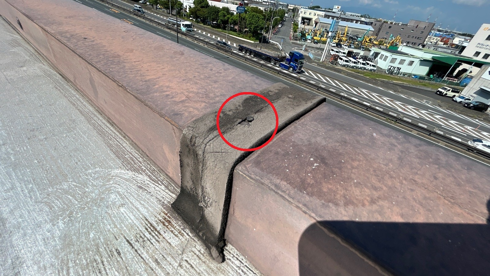 建物の屋上に上がって詳細な調査を行わせていただいたところ、屋上の笠木の角の一部が台風などの強い風で飛んで行ってしまっていました。